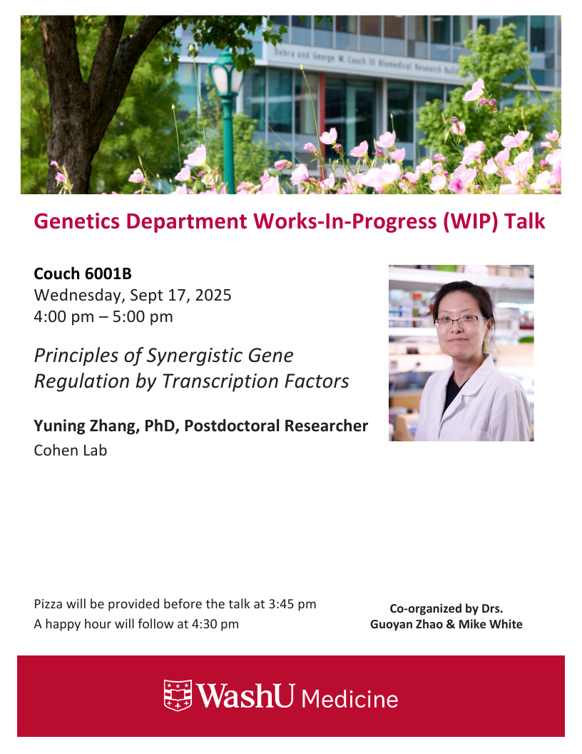 Genetics WIP Talk: Yuning Zhang, PhD Sep 17, 2025 4:00 p.m.-5:00 p.m. WIP Talks Fall 2025 Couch Bldg., Rm. 6001B Add to: Google Calendar | Outlook | iCal File