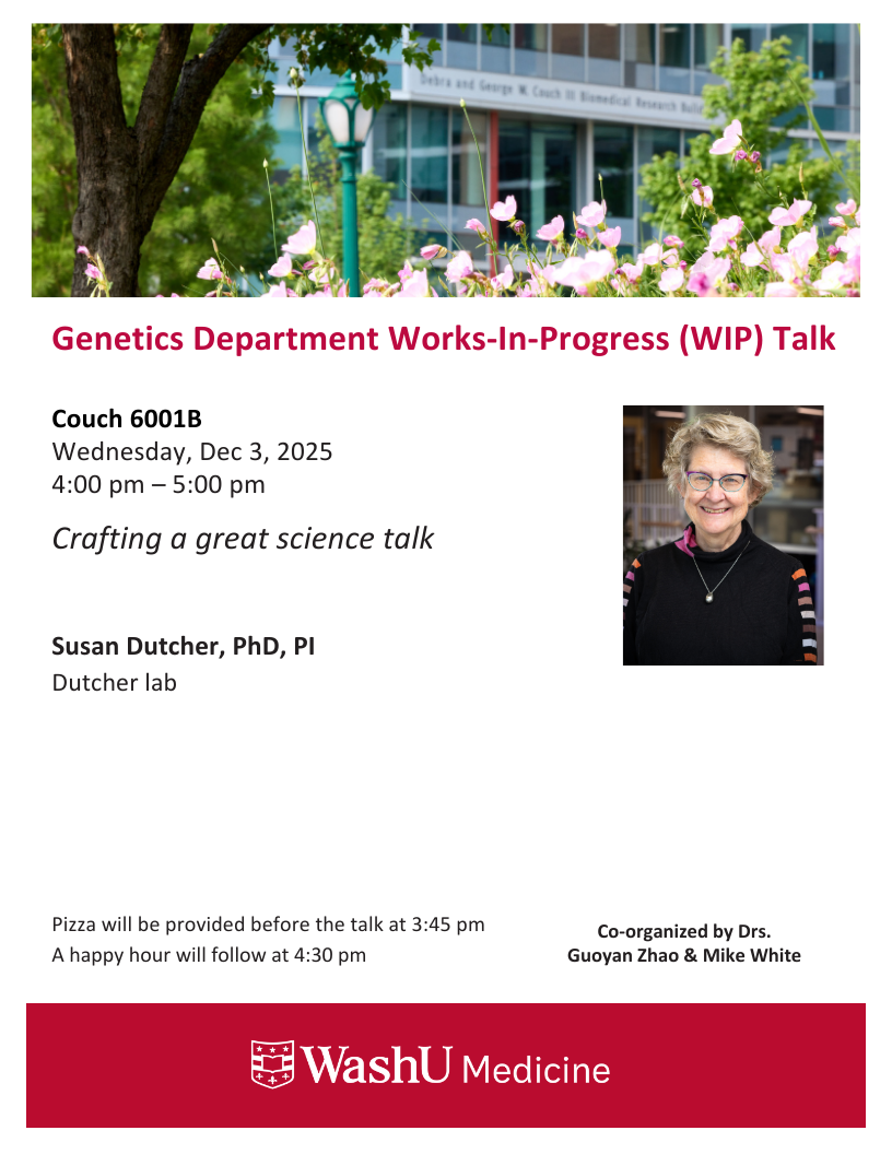Genetics WIP Talk – Susan Dutcher, PhD Dec 03, 2025 4:00 p.m.-5:00 p.m. WIP Talks Fall 2025 Couch Bldg., Rm. 6001B Add to: Google Calendar | Outlook | iCal File Susan Dutcher, PhD, presents, “Crafting a great science talk”.
