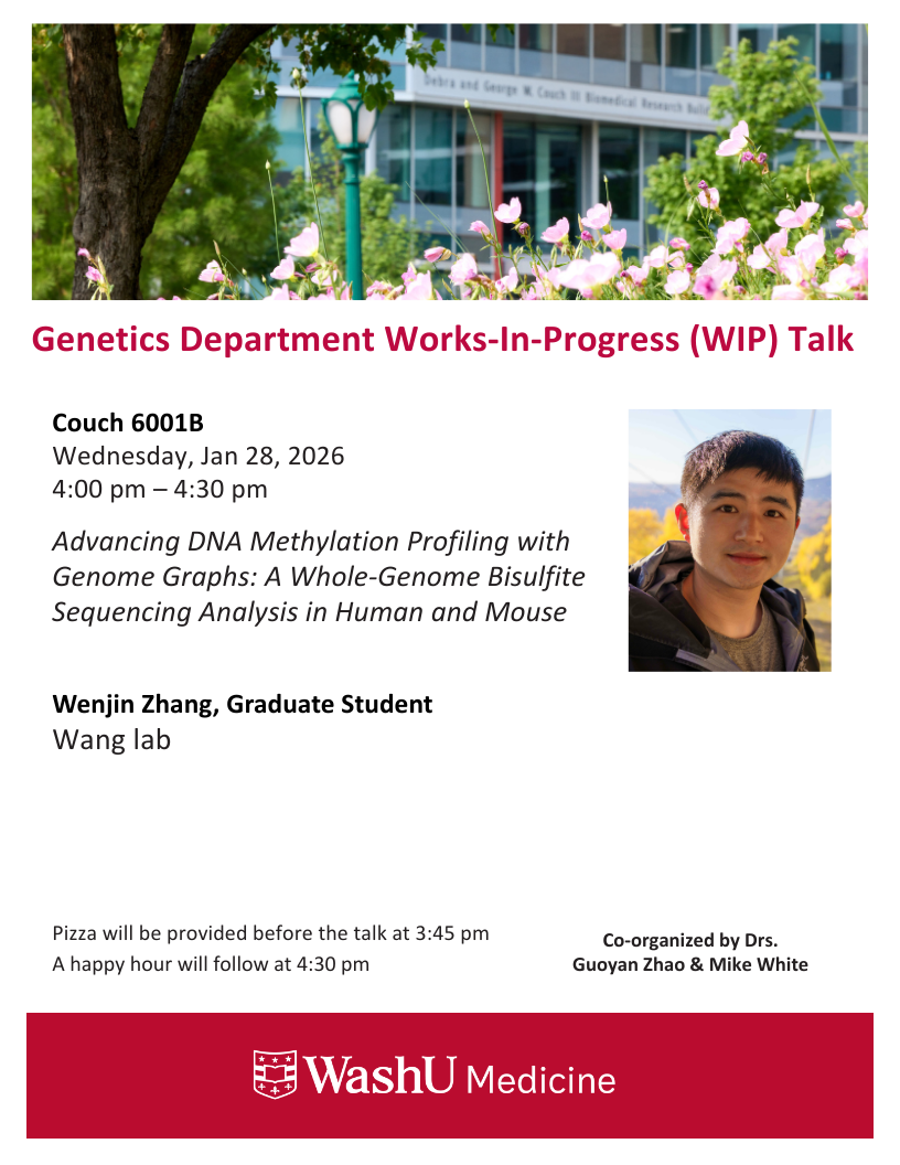 Wenjin Zhang, graduate student in the Wang lab presents, “Advancing DNA Methylation Profiling with Genome Graphs: A Whole-Genome Bisulfite Sequencing Analysis in Human and Mouse”.