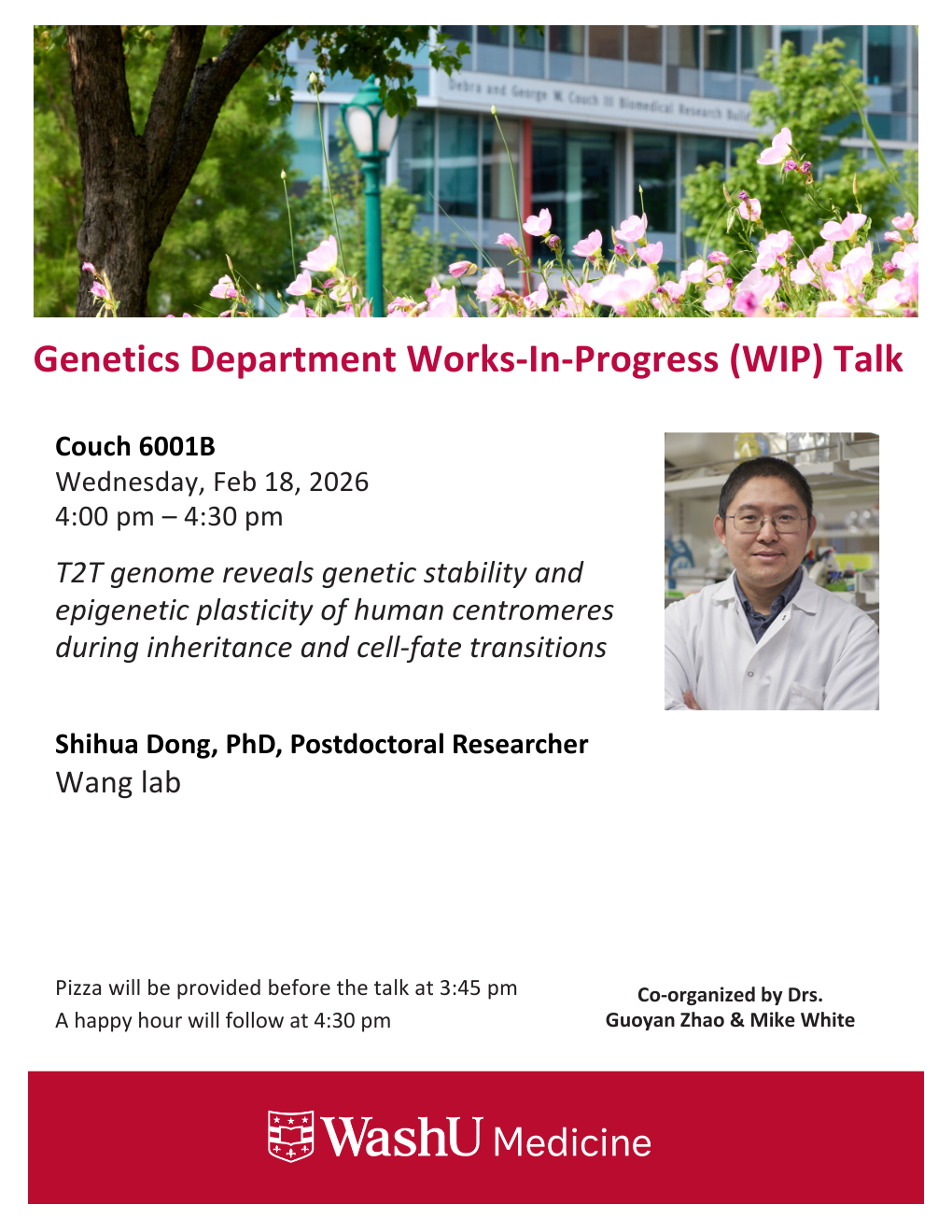 Genetics WIP Talk – Shihua Dong, PhD Feb 18, 2026 4:00 p.m.-5:00 p.m. WIP Talks Spring 2026 Couch Bldg., Rm. 6001B Add to: Google Calendar | Outlook | iCal File Shihua Dong, PhD, Postdoctoral Researcher in the Wang lab presents, “T2T genome reveals genetic stability and epigenetic plasticity of human centromeres during inheritance and cell-fate transitions”.