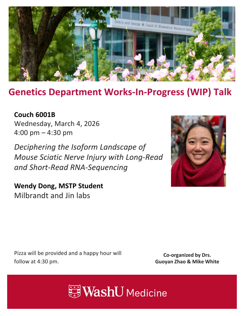 Genetics WIP Talk – Wendy Dong Mar 04, 2026 4:00 p.m.-6:00 p.m. WIP Talks Spring 2026 Couch Bldg., Rm. 6001B Add to: Google Calendar | Outlook | iCal File Wendy Dong, 3rd-year MSTP student in the Milbrandt and Jin labs presents, “Deciphering the Isoform Landscape of Mouse Sciatic Nerve Injury with Long-Read and Short-Read RNA-Sequencing”.