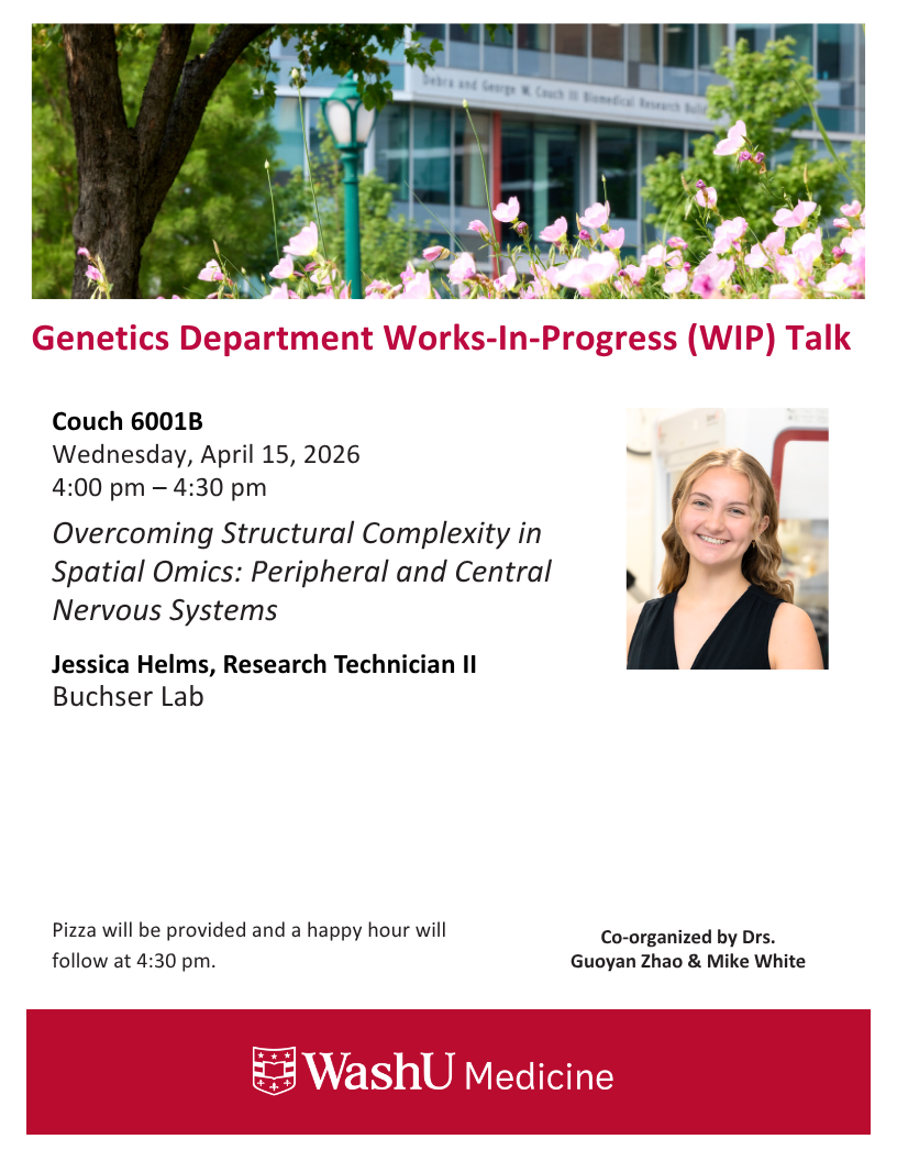Genetics WIP Talk – Jessica Helms Apr 15, 2026 4:00 p.m.-5:00 p.m. WIP Talks Spring 2026 Couch Bldg., Rm. 6001B Add to: Google Calendar | Outlook | iCal File Jessica Helms, research technician II in the Buchser Lab presents, “Overcoming Structural Complexity in Spatial Omics: Peripheral and Central Nervous Systems”.
