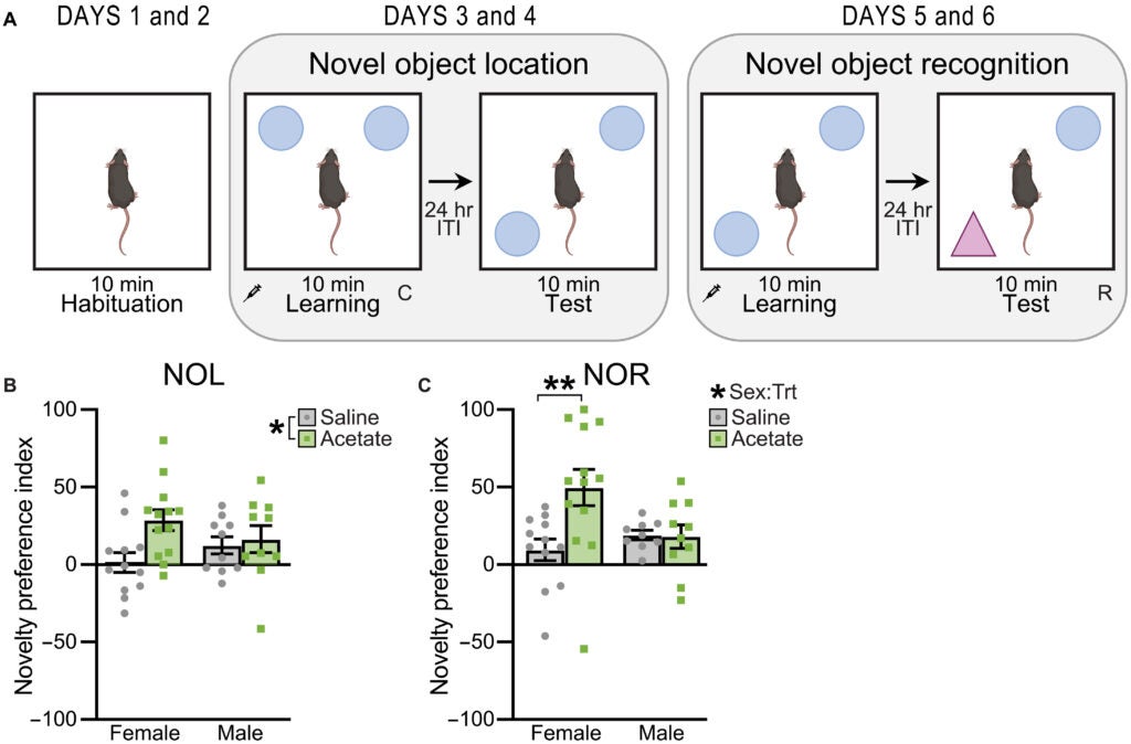 Using a combination of behavioral assays, including novel object location and novel object recognition tasks, the researchers found that acetate exposure improved long-term memory, with the most pronounced effects observed in female mice. These behavioral results were tightly linked to molecular changes in the dorsal hippocampus, a brain region critical for learning and memory.